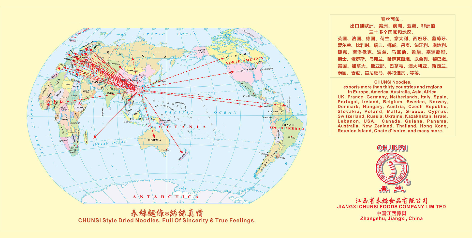 江西省春絲食品有限公司位于江西省樟樹市。 樟樹具有制作面條的悠久歷史傳統(tǒng)。古來即有民謠:“臨江府、清江縣(即樟樹),六歲伢仔會做面。” 今春絲公司是江西省內(nèi)具有規(guī)模的面條、米粉加工企業(yè),也是全國知名的面條生產(chǎn)企業(yè)。春絲公司現(xiàn)擁有“春絲”、“凌波仙子”、“絲絲福”、“春佳”四大品牌,一百多個品種。所有面條、米粉產(chǎn)品均選用合格原料,符合國家質(zhì)量和衛(wèi)生標準。產(chǎn)品具有安全健康、面體勁道、柔韌爽滑、易熟、久煮不糊、不渾湯等特色,深受廣大消費者歡迎。春絲產(chǎn)品已全面進入沃爾瑪、家樂福、樂購、歐尚、好又多、易初蓮花等大型超市,并遠銷美國、日本、英國、德國、法國、西班牙、意大利、葡萄牙、香港等二十多個國家和地區(qū)。